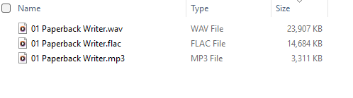 There is a huge difference in storage size. A WAV file takes up about 10 times as much space as its MP3 equivalent. We call this a 1:10 compression ratio. There are other file formats for compressed music such as FLAC or ALAC which use a lossless form of compression. These typically only achieve a 1:2 compression ratio.