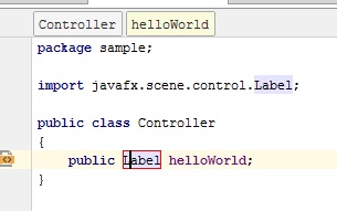 • Pressing Alt-Enter suggests a “quick fix” in IntelliJ to create a Label field called helloWorld. Click to accept, and it will switch to the Controller file and insert a line. Press enter to accept the line. Note that an import statement has been added above too.