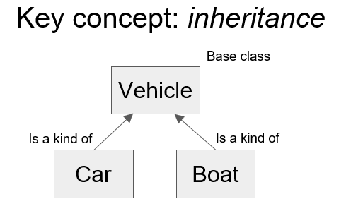 Imagine we were writing a game like Grand Theft Auto. The player rides around in vehicles and can interact with (i.e. crash into!) other vehicles. This is a great application for classes with inheritance. So a Car class will be based on a Vehicle and will inherit all its methods and attributes. The same goes for Boat.