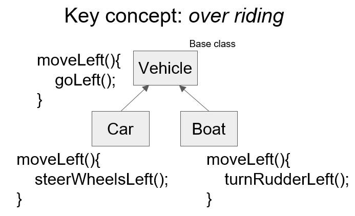 Polymorphism is a way to allow sub classes to behave differently from the base class. Both the car and the boat objects might have move() methods. However, is the way they move the same? Probably not, if the vehicle class has a move() method, it can be replaced by a new move() method within the car class, and a different one again in the boat class.